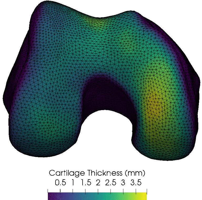 I am a musculoskeletetal health researcher and entrepreneur. I am particularly passionate about developing novel tools to analyze biomechanical and medical imaging data to quantify the musculoskeletal system and leveraging those tools to provide novel insights. The above GIF exemplifies what I’m interested in - it is a visualization of a statistical shape model of bone shape and cartilage thickness (colorization) that I created.